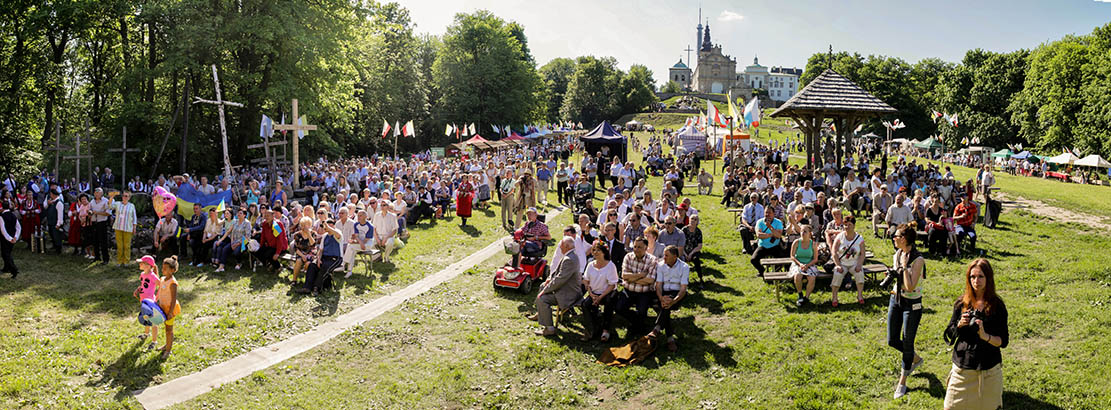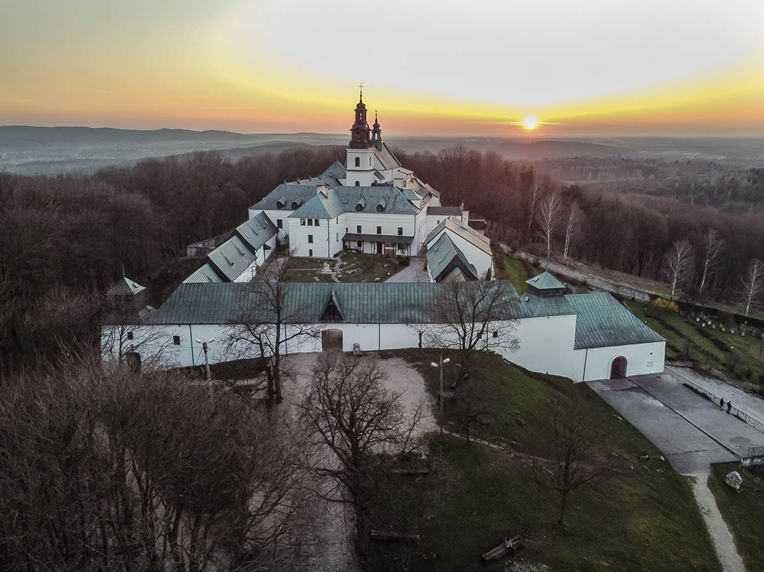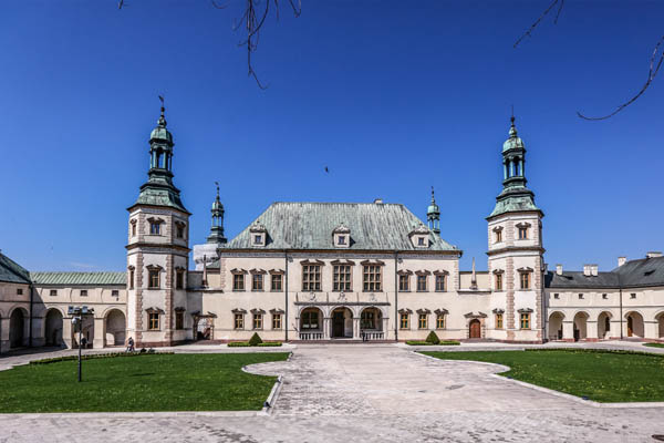 W 1643 roku opat Stanisław Sierakowski rozpoczął przebudowę kościoła dodając do fasady gotyckiego korpusu dwie barokowe wieże, wczesnobarokową kamieniarkę odrzwi i okien o wysokim poziomie artystycznym i od południa kaplicę Matki Boskiej Bolesnej. W 1655 roku kościół złupili Szwedzi, którzy wymordowali część zakonników. Dnia 22 marca 1661 roku, jak podawała najstarsza polska gazeta Merkuriusz Polski Ordynaryjny, król polski Jan II Kazimierz Waza wraz z małżonką oraz dworem zmierzając do Warszawy wstąpił do sanktuarium.