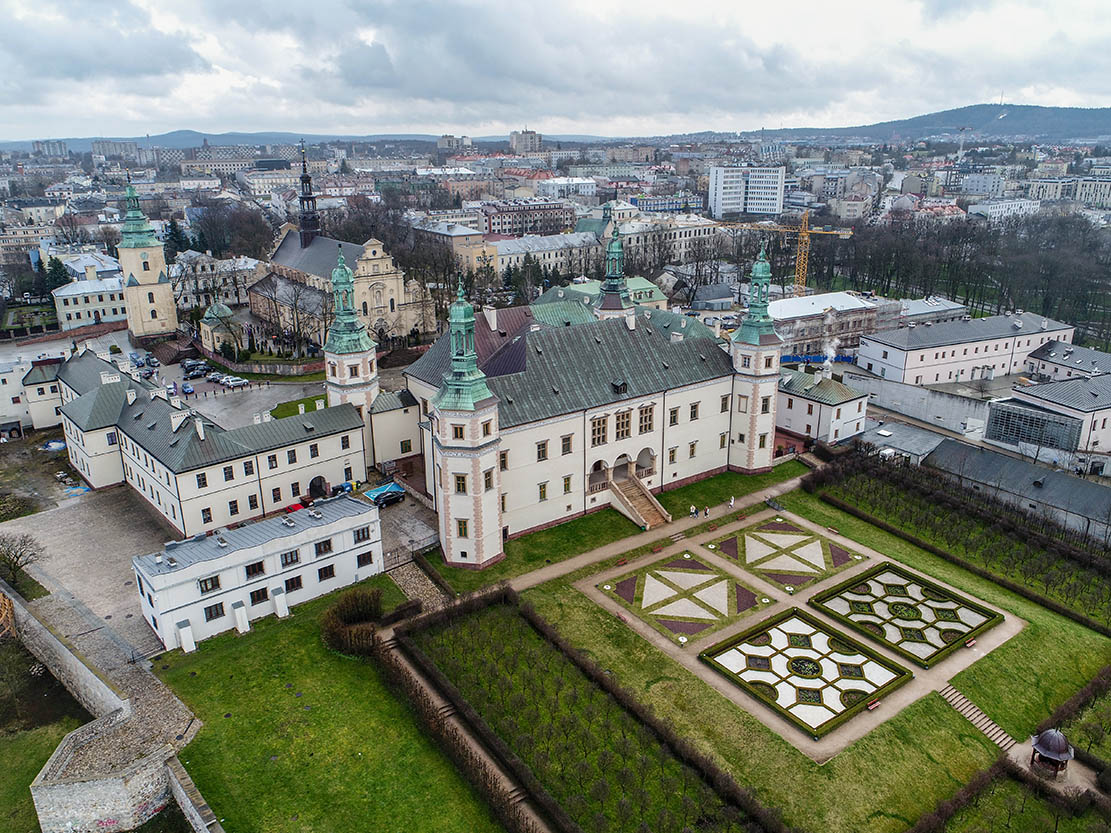Budowla powstawała w latach 1637–1641. Wzniesiono ją na Wzgórzu Katedralnym z inicjatywy i prywatnych funduszy kanclerza wielkiego koronnego i biskupa krakowskiego Jakuba Zadzika. Budowę prowadził Tomasz Poncino, a projekt został wykonany prawdopodobnie przez Giovanniego Trevano. Dekorację malarską wnętrz wykonał warsztat Tomasza Dolabelli. Plafony przedstawiały między innymi sąd nad braćmi polskimi i rokowania pokojowe w okresie wojen ze Szwecją i Rosją, w których brał udział fundator. Pałac otaczał mur obronny ze strzelnicami kluczowymi i puntone. Cztery wieże pokryto blachą. W 1667 roku biskup Andrzej Trzebicki pokrył pałac dachówką. W 1806 Franciszek II Habsburg cesarz Austrii przekazał pałac będący własnością skarbu państwa na potrzeby nowo utworzonej diecezji kieleckiej[2]. W 1816 r. Stanisław Staszic stworzył w pałacu Szkołę Akademiczno-Górniczą. Po Powstaniu styczniowym zaborcy usunęli hełmy na wieżach i figury posłów moskiewskiego i szwedzkiego na frontonie. Pałac w XX wieku pełnił rolę sztabu legionowego Józefa Piłsudskiego, biura werbunkowego, drukarni, poczty, biura przepustek i siedziby redakcji lokalnego dziennika. W latach 20. według projektu Szyszko-Bohusza zrekonstruowano barokowe hełmy na wieżach. W latach międzywojennych urząd wojewódzki. W latach 1945–1971 siedziba Wojewódzkiej Rady Narodowej. Od 1971 r. mieści się w nim Muzeum Narodowe. Z tyłu pałacu, w 2005 roku otwarto Ogród Włoski. [źródło: Wikipedia]